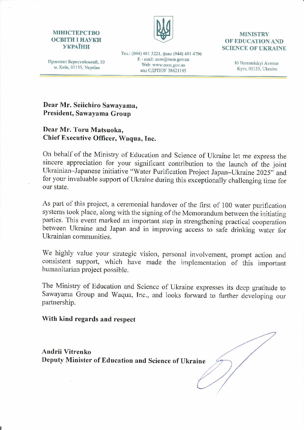 Waquaは、澤山グループと連携して推進するウクライナ向け国際水支援の取り組みに関し、